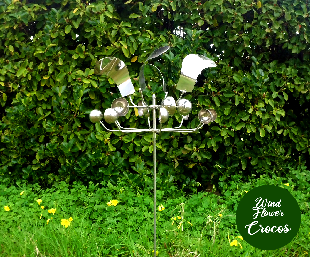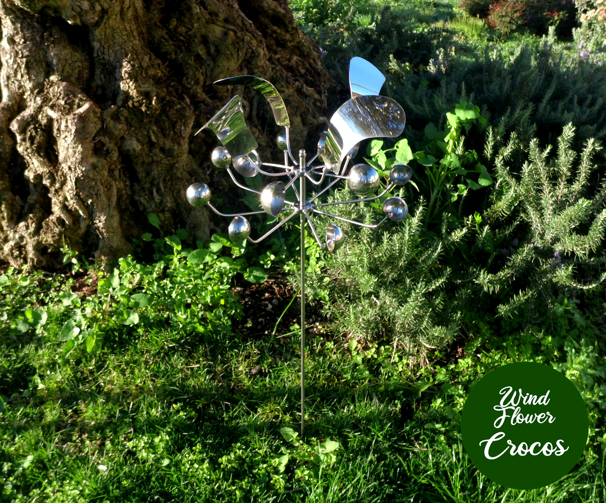 The Wind Flower Crocos spins effortlessly with even the slightest gust of wind, creating a mesmerizing display of movement and light. Push it into the ground and position it vertically for a striking garden centerpiece. For a versatile touch, it can also be converted into a kinetic wind spinner to hang from a tree or a cornice.