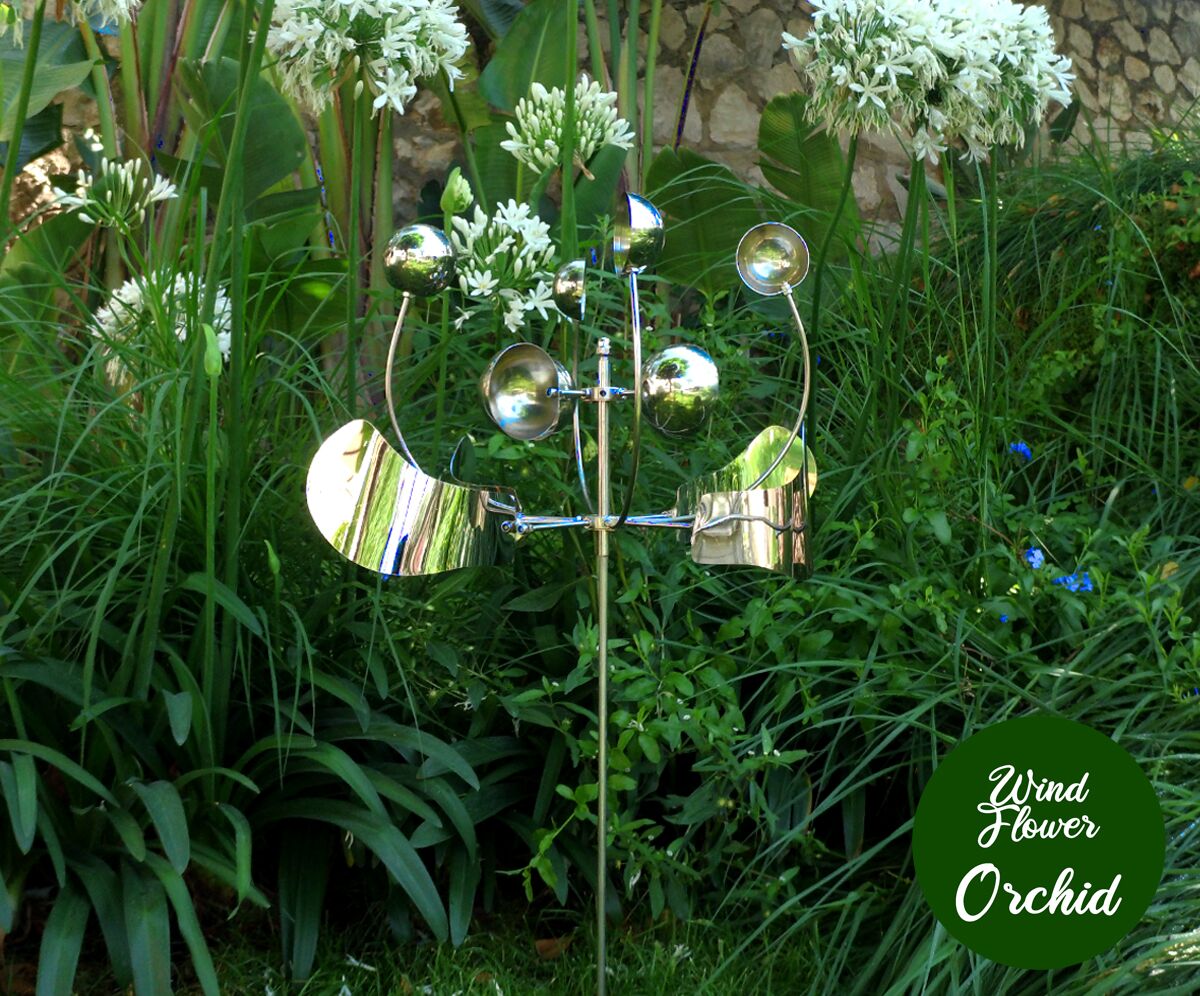 Wind Spinner Orchid can easily be transformed into a kinetic wind flower. Simply place this kinetic flower amongst garden shrubbery or flowers by pushing it into the ground and positioning it vertically. It will spin gracefully with the breeze, adding a captivating touch to your outdoor space.
